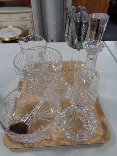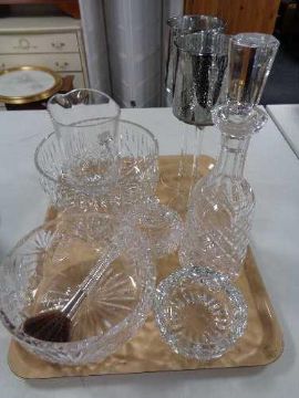 A tray of glass ware, crystal decanter, fruit bowl, water jug etc
