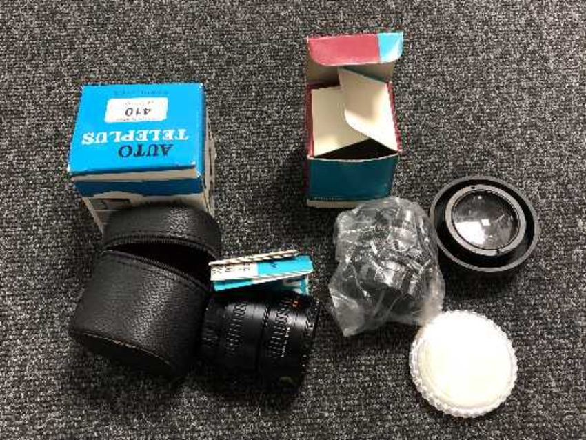 A boxed Auto Tele plus variable lens, Photax pre set lens and filter