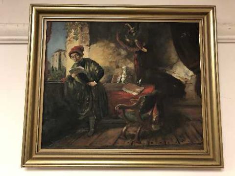 Continental School : oil on board depicting a gentleman reading by a balcony