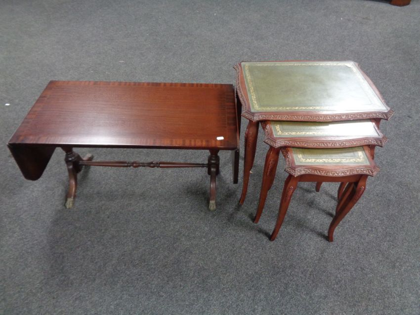 A nest of three glass and leather topped tables together with a flap sided coffee table