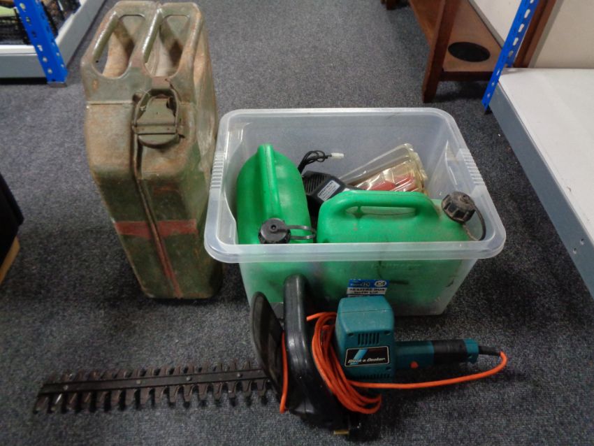 A box of Black and Decker hedge trimmer, two fuel cans, 20l jerry can