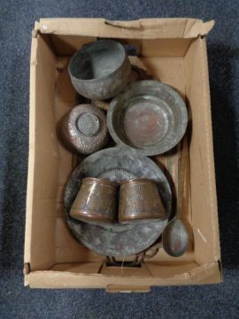 A box of antique Eastern copper ware, trays, planters, bowl etc