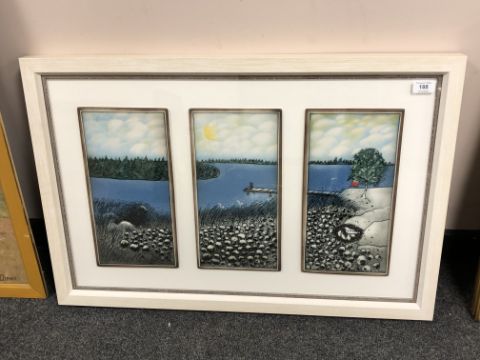 Helja Liukk-Sundstrom for Arabia of Finland : A person sitting on the end of a jetty looking out on to a meandering river with a rocky bank to the foreground, a triptych of ceramic wall tiles, each of the three panels signed by the artist, each 35 cm x 18 cm, framed overall as one, total framed size 55 cm x 82 cm.