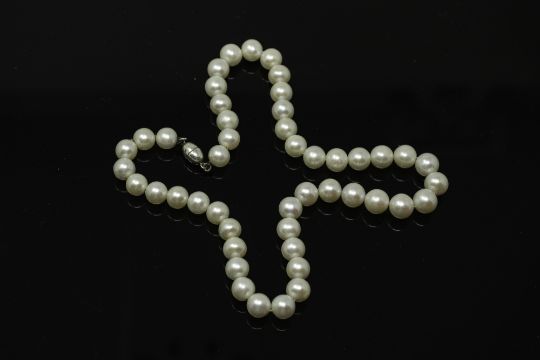 A cultured pearl necklace with sterling silver clasp, length 42 cm.