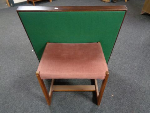 A mid century teak dressing table stool upholstered in pink dralon and folding card table