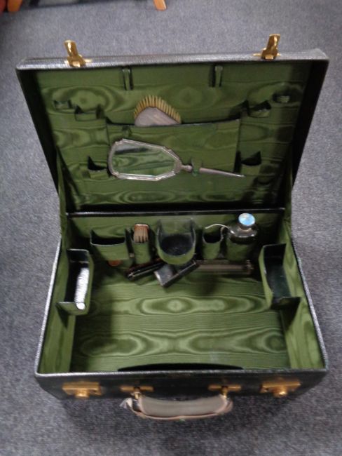 A Twentieth Century black vanity case with a fitted interior and lined with green satin, contents not complete but the lot does include a silver-backed hand mirror, two silver-backed brushes, a pair of tall and slim silver-lidded glass bottles, a cologne bottle with blue enamel lid, two case hair combs and a rectangular lidded pouch, the top of the case embossed in gilt with the initialed "L.M. B-O.", with brass fittings and catches, overall dimension 51 cm x 36 cm x 19 cm.