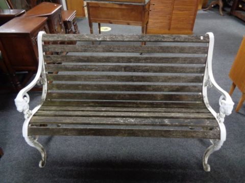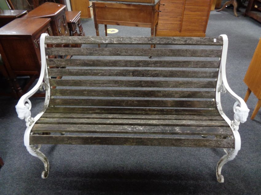 An early twentieth century cast iron wooden slatted garden bench with lion mask arms