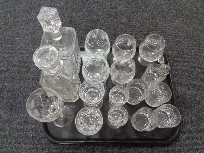 A tray of glass ware, Whisky decanter, crystal glass etc