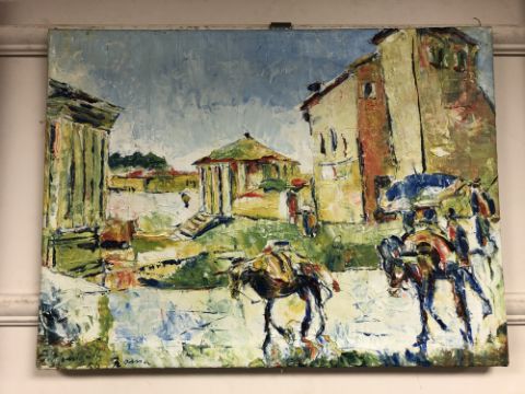 Continental school, donkeys in a street, oil on canvas