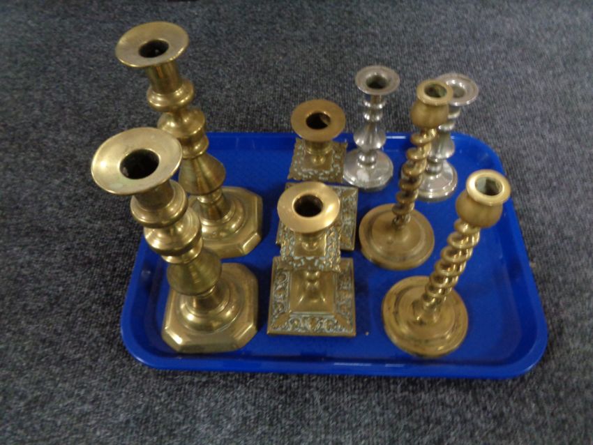 A tray of three pairs of brass candlesticks and further pair of plated candlesticks