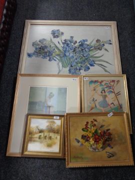 Mike Knight : An Arched Stone Bridge Spanning a River with White-washed House Beyond, acrylic on board, signed, dated '81, with labels verso, 22 cm x 22 cm, together with an oil painting on canvas depicting mixed flowers in a bowl and signed "Matekwick", an indistinctly signed colour print depicting a ballet dancer in a long pink skirt and numbered 40/500, a colour print after Vincent Van Gogh "Irises" and finally a needlework panel depicting a young girl holding flowers and walking a white dog, all parts framed. (5)