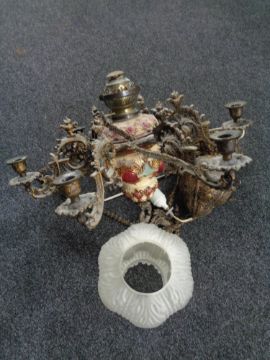 A continental glazed pottery six branch oil lamp with frosted glass shade
