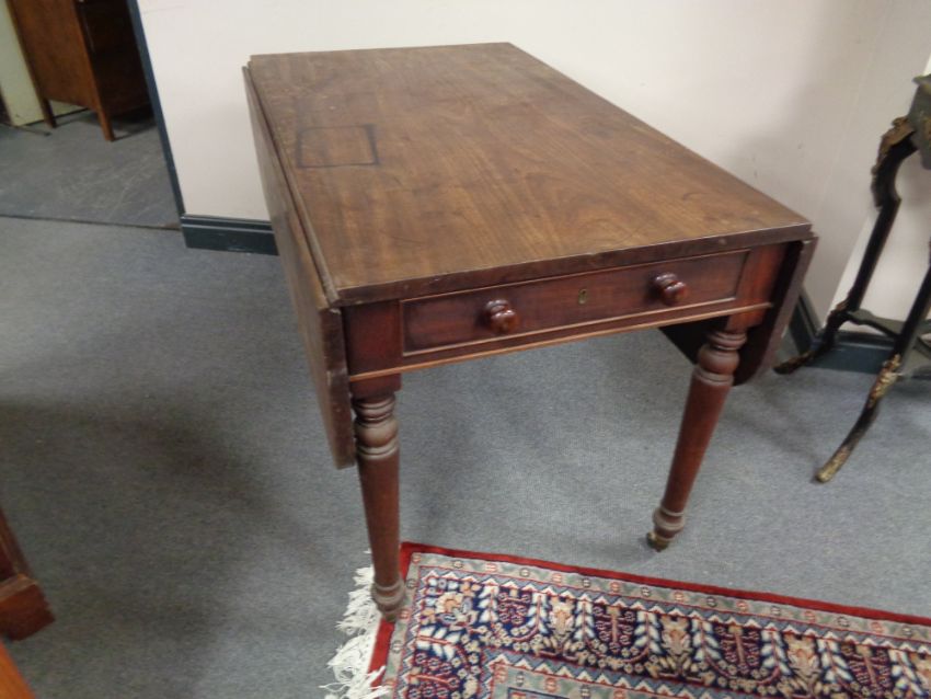A Victorian mahogany flap sided table fitted with two drawers