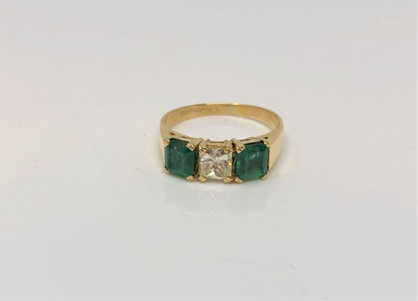 The ring is in good condition. The diamond and emeralds are free of any major chips but do have slight abrasions when viewed under close magnification. Shank is in good condition and bears a full set of hallmarks for Sheffield 1990, with maker's mark E F Ltd. Weight 3.7g.