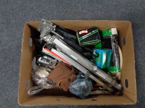 A box of camera equipment, tripod, Tokina vivita camera, Brownie reflex etc