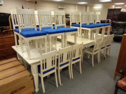 A twentieth century painted dining table, length with five leaves 452 cm, together with a set of twelve painted chairs and another set of twelve similar painted chairs. (25)