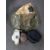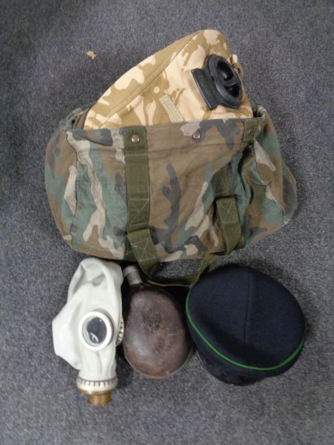 A military style camo bag containing WW II water bottle, gas mask, military cap etc