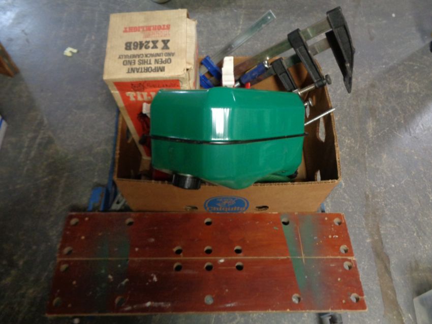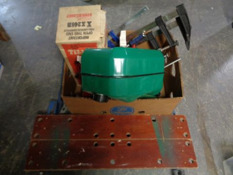 A Black and Decker work mate together with box of Rhino cam axle stands, Tilly lamp, clamps etc