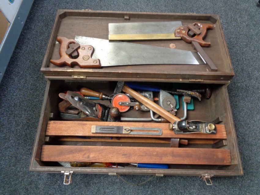 A joiner's tool box of tools, stanley planes, hand saws, brace etc