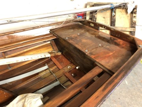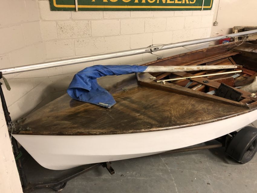 A 14' sailing boat with sail, with plaque 'Built by The Aln Boatyard, Alnmouth', on trailer