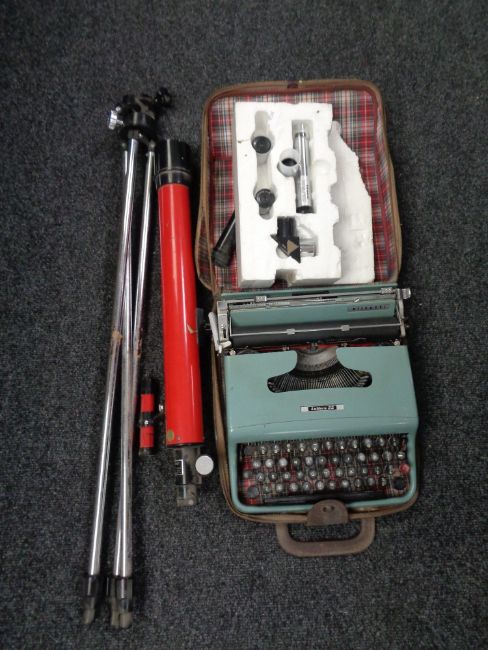 A box of telescope with accessories on stand, Lettera 22 typewriter in case