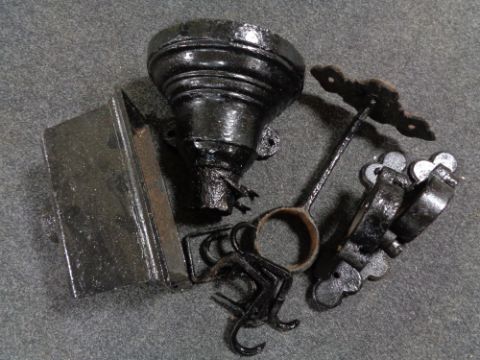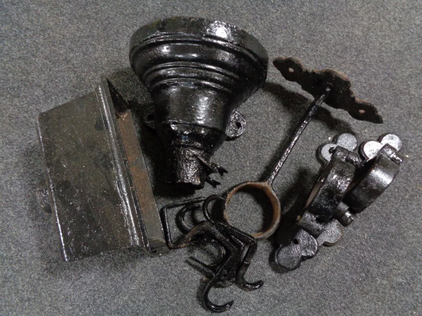 A box of antique cast iron drain hoppers, brackets, salvaged parts etc