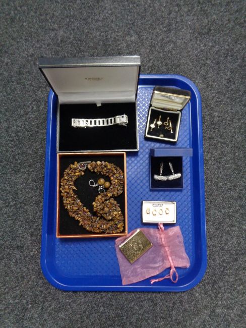 A tray of silver bracelet, Swarovski cuff links, dress stud, necklace etc.