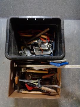 Two boxes of hand tools to include spirit levels, saws, clamps, brace etc