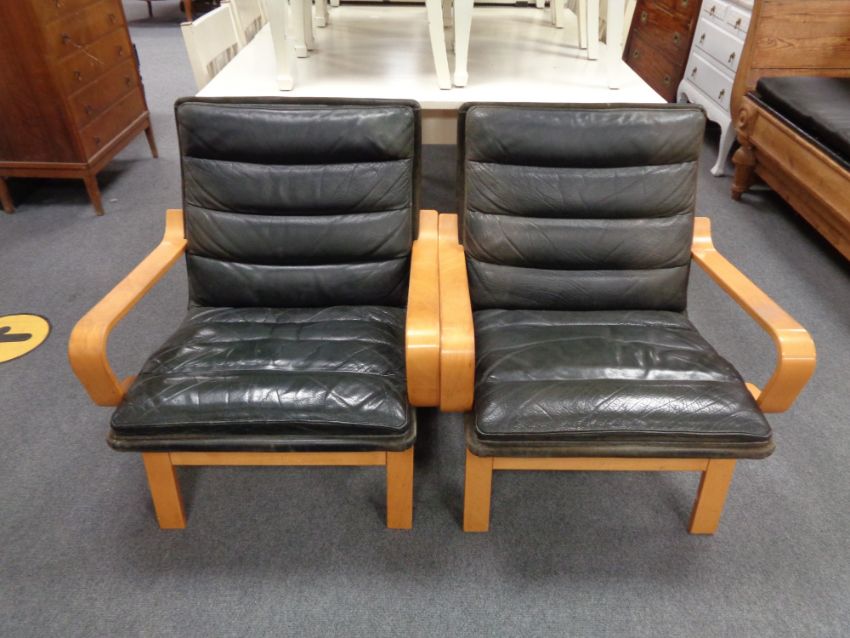A pair of twentieth century beech framed armchairs in black leather