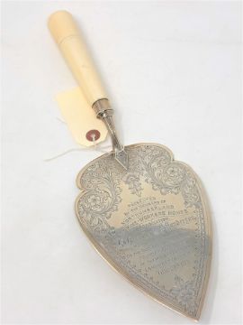 Morpeth Interest : A large silver plated slice with turned ivory handle, 'Presented by the Members of Northumberland Aged Mine-Workers' Homes Association, To Councillor W. S. Sanderson Mayor of Morpeth, on the Occasion of his Laying a Foundation Stone of Their Cottages at Longhurst Colliery, June 20th 1914".