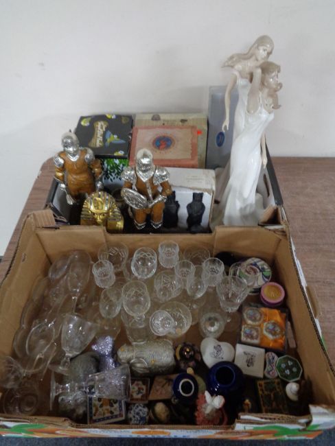 Two boxes of ceramic figures, glass, ornaments etc