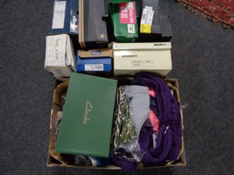 Two crates of shoes, clothing etc, Clarkes shoes etc