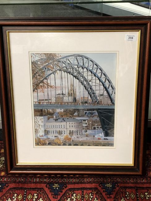 After Charlie Sprigg : View of The Tyne Bridge Fromthe South with The Cathedral Beyond, reproduction in colours, signed in gold pen, 36 cm x 30 cm, framed.