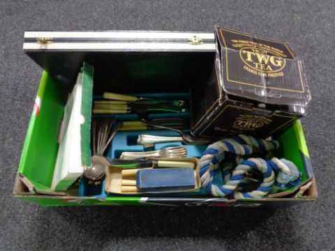 A box of cutlery, rope lead etc