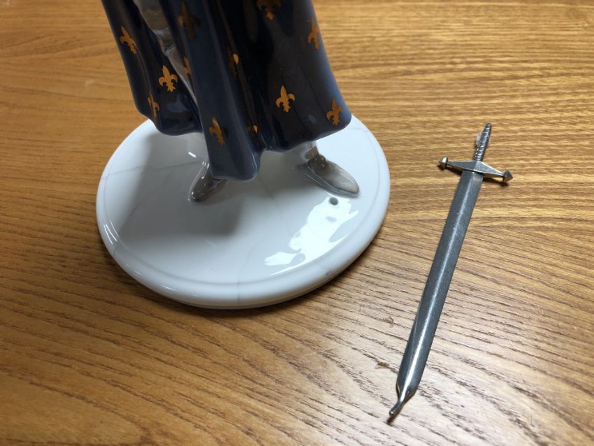 Sword loose and needs reglueing to her hand. Tip of sword slightly bent. Shaft of flag pole is missing, sadly. Otherwise good condition.