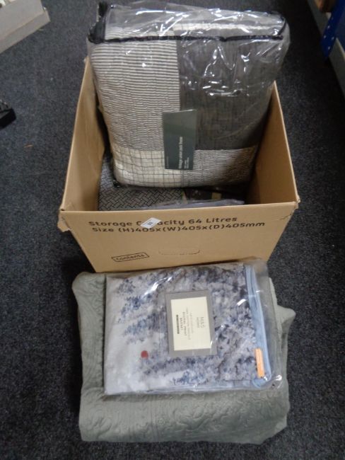 A box of Marks & Spencer cotton bed sets, Union Jack throw, etc