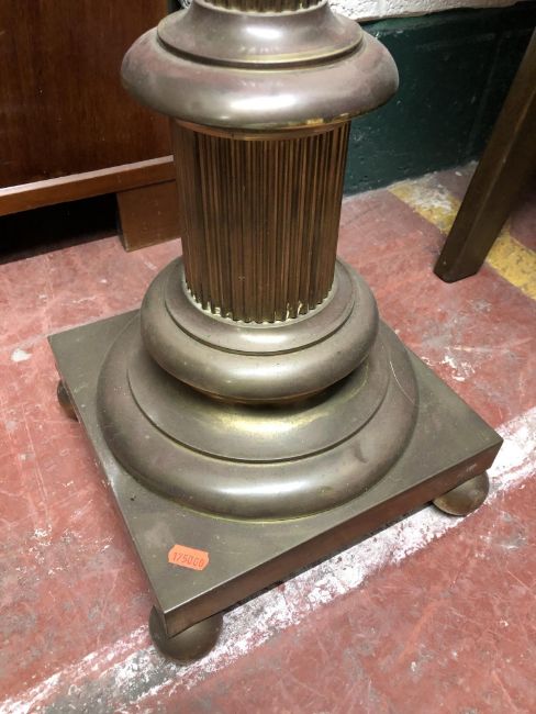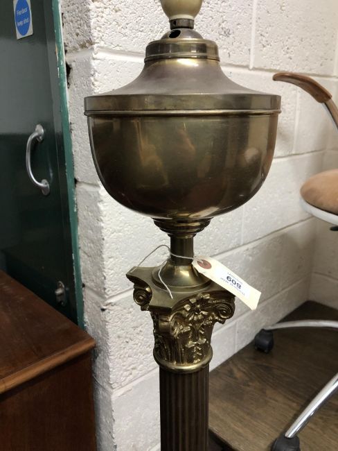 This has continental wiring and has not been tested. Several shallow dents to the brass. See images. Overall height 145cm.