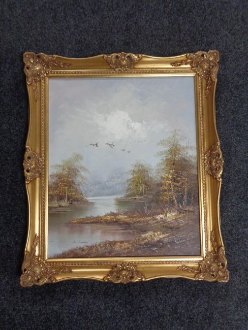 A gilt framed oil on canvas - Ducks in flight over a pond