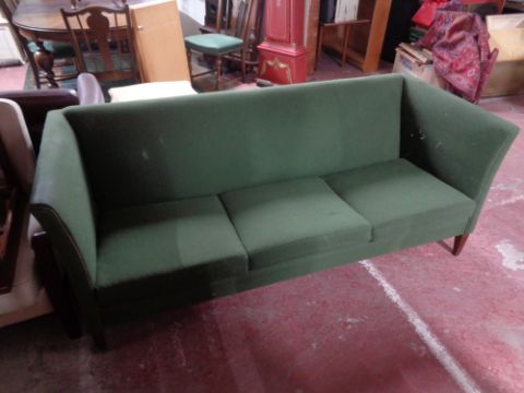 Height 74 cm, width 190 cm, depth 83 cm. Corded fabric, dirty and needs re-covering but not damaged. Seat depth 56 cm, frame seems strong, stands on wooden feet probably stained pine or teak.