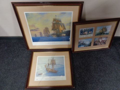 A framed sailing print - HMS Armageddon, Nelsons first flag ship leads the squadron, Mediterranean, signed by Jeff hunt, one further sailing print and montage.