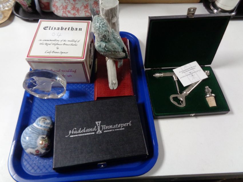 Two sets of Norwegian pewter bar tools, Kosta Crystal paperweight, Royal Crown Derby sleepy tabby kitten, etc.