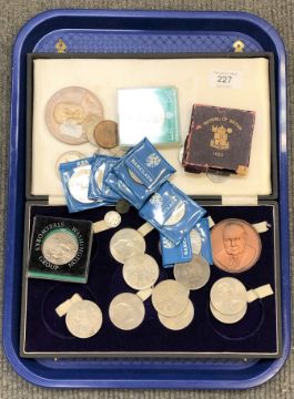 A tray of part Winston Churchill coin set, commemorative crowns, festival of Britain coin etc