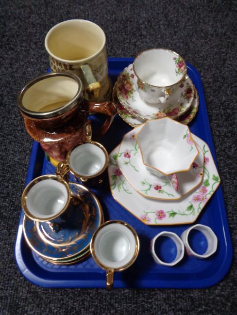 A Crown Devon musical Widdicombe fair mug together with Royal Albert trio etc