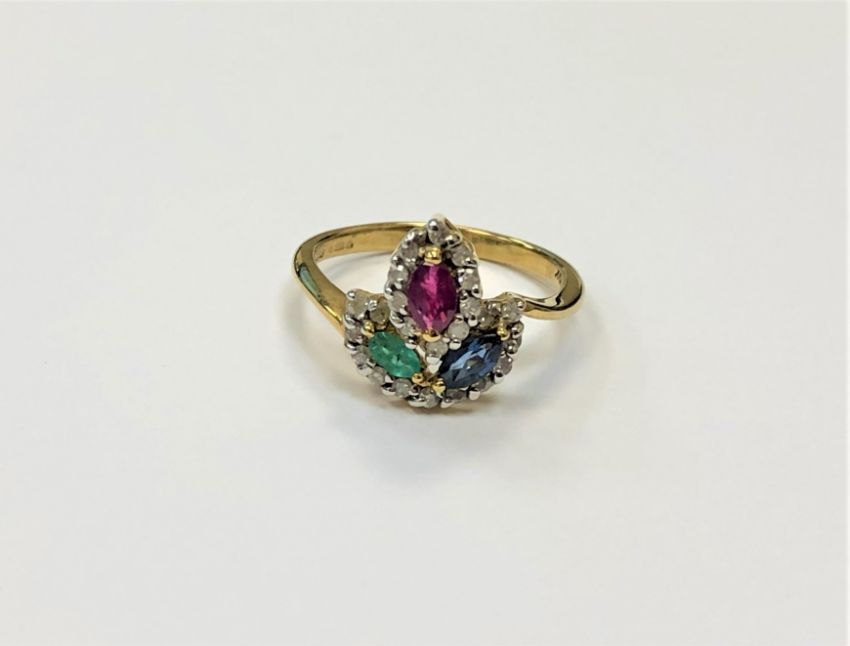 A 10ct gold ruby, sapphire, emerald and diamond ring, size M/N.