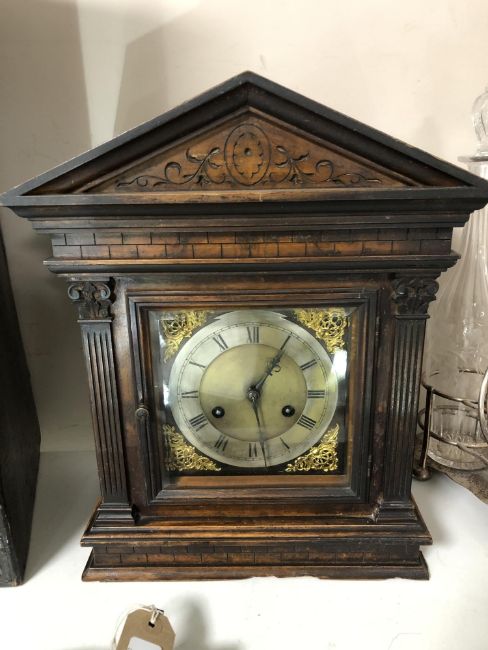 An Edwardian carved pine cased bracket clock with brass and enamelled dial