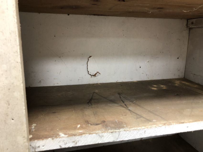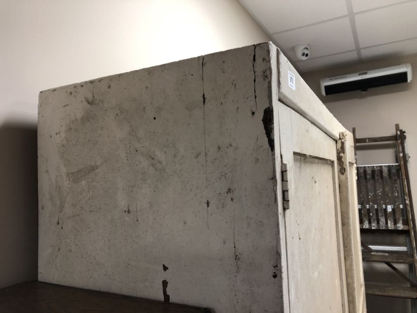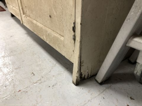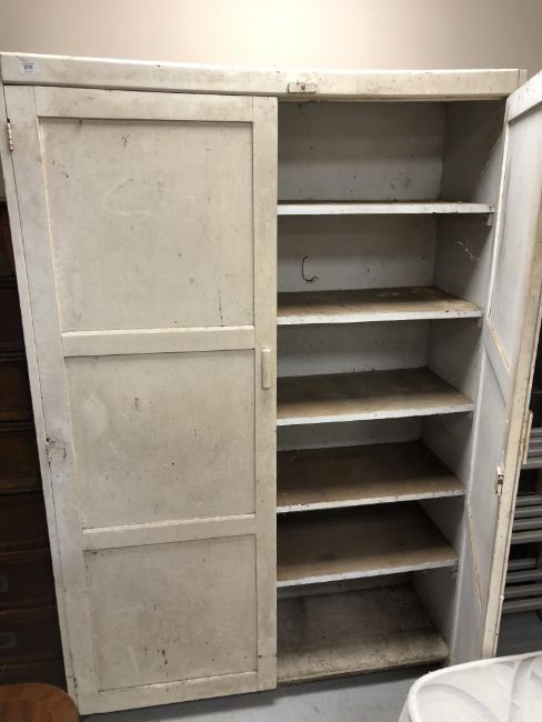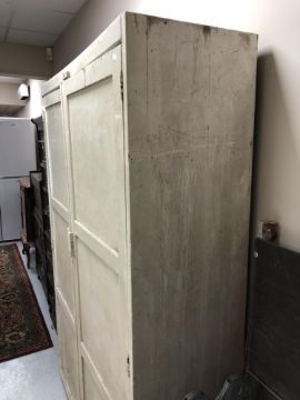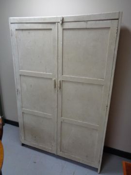 Generally in distressed condition with losses to paint etc. Catch on left door is broken and it will not open. Small hole in the back panel. See images. 122cm wide by 40cm deep by 183cm high.