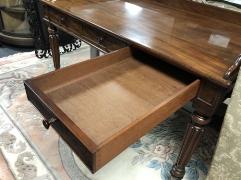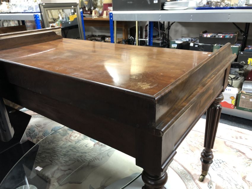 A William IV mahogany library/writing table fitted with three drawers on turned legs raised on brass castors