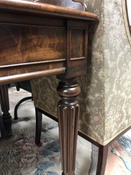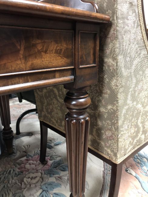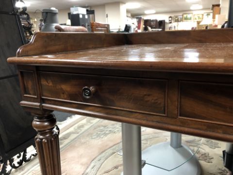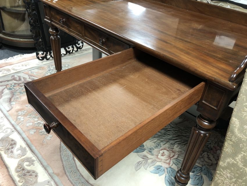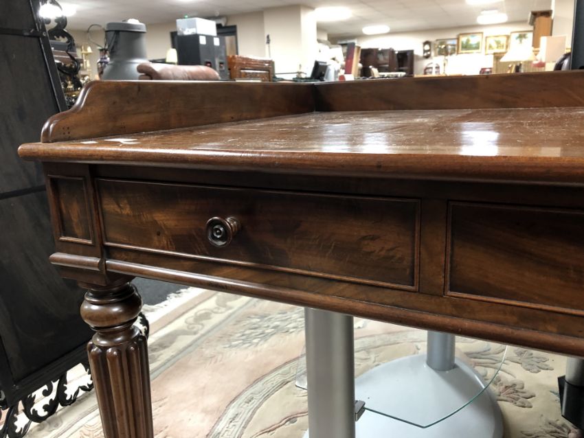130cm wide by 76cm deep by 82cm high. The height to the underside of the desk is 60cm. Watermarks to upper-left of writing surface, as well as a small veneer replacement. Central drawer with damage to turned handle, piece not present. Loss to moulding on front left corner, piece is present. Similar losses to moulding on back-right corner, right side and front-right corner, pieces are not present. Drawers run smoothly. See images.