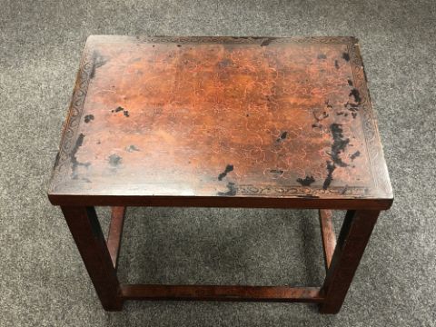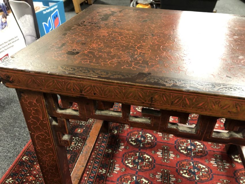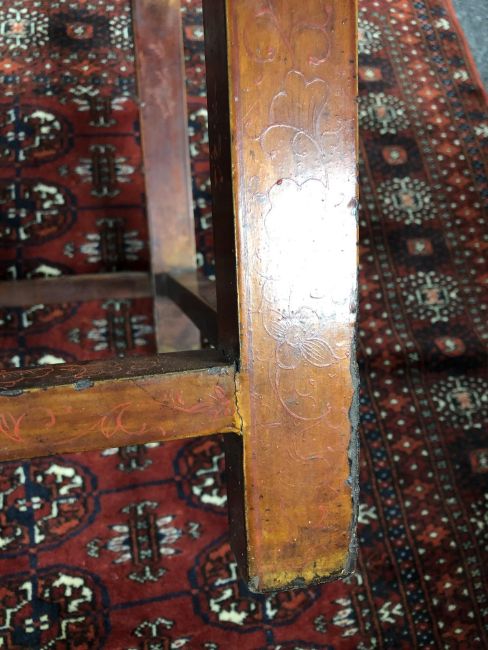 Generally in distressed condition. Wear to lacquer all over. Some is flaking away and there are splits forming. A small piece of the carved frieze is missing in one corner. An area on one leg has been painted over with black paint to cover up a repair. The joints are a little loose. 57cm wide by 42cm deep by 49cm high. See additional images.