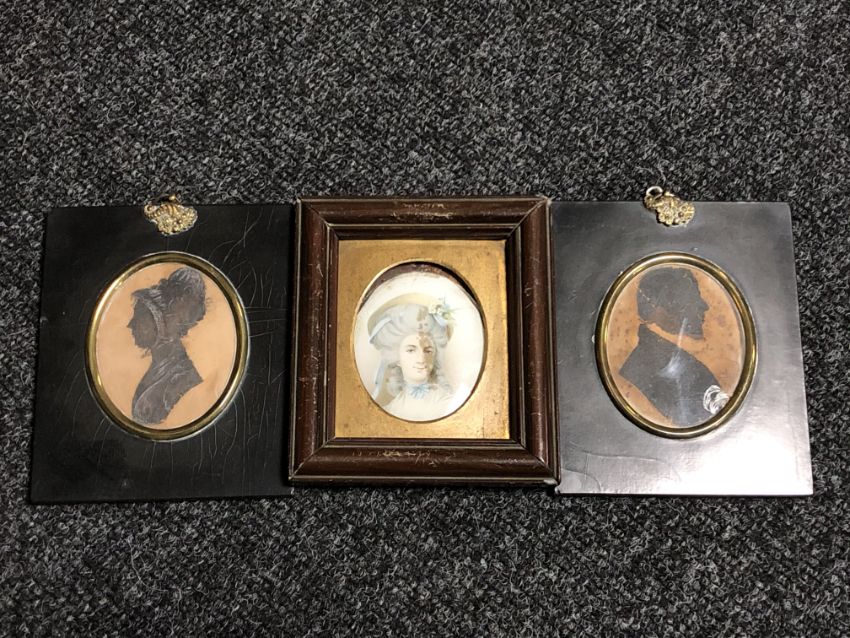 Two George III silhouette type miniatures together with a further portrait miniature behind glass.